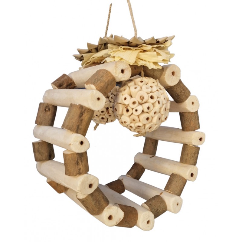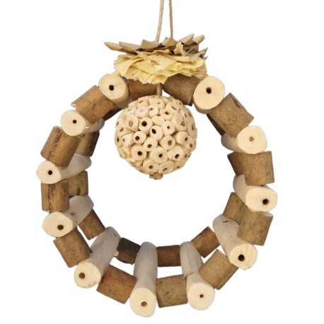 Divertido columpio en forma de aro compuesto por piezas talladas en raíz de yuca, material 100% natural con el que se elabora la tapioca. Este material es muy fácil de triturar, les encanta hacerlo miguitas ya que es muy similar a las palomitas de maíz